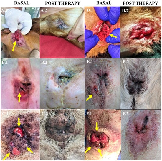 Perianal fistulas (PFs) are painful ulcers that appear spontaneously on the skin surrounding the anus of dogs of any breed, with German Shepherds being the most affected (more than 80% of the population), followed by beagles at 4% [1], while in other breeds, no incidences have been described. They are an immune-mediated condition in which the current standard treatment is pharmacological. Cyclosporine is the recommended treatment of choice, but it may be associated with numerous adverse [2] and surgical effects. This condition can be debilitating for the affected dogs and can lead to euthanasia if not treated effectively [3]. Canine perianal fistula (PF) is considered a condition analogous to human perianal Crohn’s disease (CD), as the anatomy and size in dogs (especially large breeds) is very similar to that of humans, allowing the dog to be used as an animal model to evaluate new treatments and subsequently conduct human clinical trials [4].