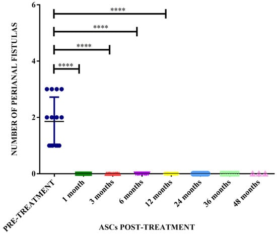 Comparison between the number of fistulas presented pre-treatment and the number of fistulas after treatment with allogeneic adipose stem cells (ASCs) and statistical analysis between pre-treatment and 1, 3, 6, 12, 24, 36, and 48 months post-treatment. **** means a significant difference of p < 0.0001.