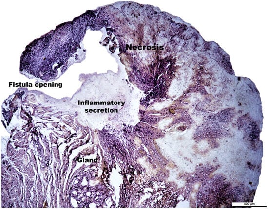 Histopathological representation of the biopsy of the perianal fistula before ASCs treatment. The microphotograph shows the opening of the fistula, accumulation of inflammatory secretions in the saccule and adjacent tissues, as well as necrosis and chronic inflammation in the epidermis. Bar scale = 400 µm. Staining with haematoxylin and eosin.