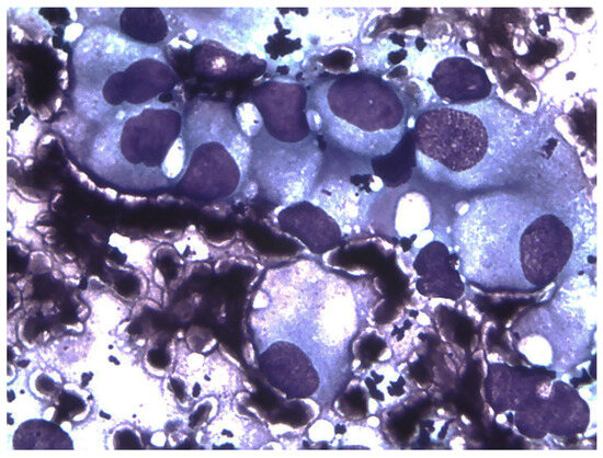All dogs in stage III had previously undergone pancreatectomy and presented with hepatic metastases. In all 29 dogs, cytological analysis of the aspirates demonstrates clusters of cells characteristic of neuroendocrine tissue. These cells exhibit a morphology with free nuclei embedded in the cytoplasm, lacking distinct cell boundaries [1] (Figure 4). Radiofrequency ablation was applied to the pancreatic nodule in stage I patients, to both the nodule and lymph nodes in stage II patients, and to the hepatic lesions in stage III patients.