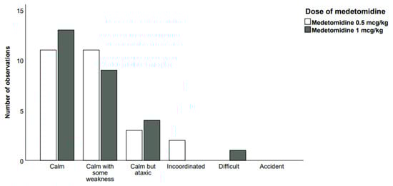 Although trials have reported the same reliability of results, regardless of the complexity and lack of a validated scale, we used a composite scoring system in this study. Compared with simpler scales, the composite scoring system considers most of the factors that impact recovery quality, thus reducing subjectivity [43,44]. In a study using a methodology and recovery scale similar to that used in this research, most recoveries obtained scores of 2 and 3, whereas the recovery quality was mostly 1 and 2 in the current study. Notably, the abovementioned study used postanaesthetic sedation of 2 μg/kg of medetomidine IV, thus implying that a higher dose does not necessarily equal better quality recoveries [26].