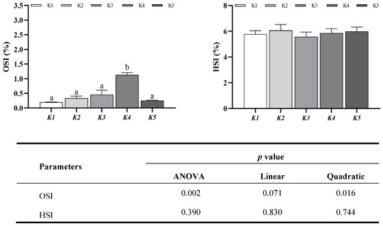 As shown in Figure 1, as far as the ovarian index is concerned, compared with K1, the ovarian index of M. rosenbergii in the K4 group is significantly increased (p < 0.05), and there is no significant difference in the ovarian index of M. rosenbergii in the K2, K3, and K5 groups (p > 0.05). The changes in the ovarian index of M. rosenbergii were quadratic (Quadratic, p < 0.05) with increasing levels of Antarctic krill oil. For the hepatopancreatic index, there was no statistically significant difference (p > 0.05) in the hepatopancreatic index between the groups of M. rosenbergii.