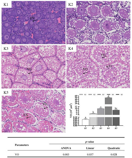 As shown in Figure 2, a large number of basophilic endogenous vitellogenesis-stage oocytes is present in the ovarian tissues of groups K1 and K2, and a large number of eosinophilic exogenous vitellogenesis-stage oocytes with many eosinophilic yolk granules (YGs) is present in the cytoplasm of the ovarian tissues of groups K3, K4, and K5. At the same magnification of the light microscopic field of view (40×), group K4 had the lowest number of oocytes and the largest YGs of oocyte cytoplasmic deposition. Oocyte volume was significantly higher in groups K2, K3, K4, and K5 compared to group K1 (p < 0.05). The highest values were found in group K4 (p < 0.05). Oocyte volume increased linearly (p < 0.05) and quadratically (p < 0.05) with the addition of Antarctic krill oil.