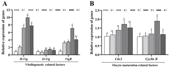 As illustrated in Figure 3, it is evident that, when the quantity of krill oil supplementation is within the range of 4.5% or below, the transcription level of Vtg in the hepatopancreas exhibits a notable increase with the augmentation of krill oil supplementation (p < 0.05). This pattern was observed up until the point where the addition amount reached 6%. A significant increase in the transcription level of Vtg, Cdc2, and Cyclin B in the ovary of the K4 group was observed in comparison to control group K1 (p < 0.05). Compared with control group K1, the transcription levels of VtgR in the ovaries of the K2, K3, K4, and K5 groups were significantly increased (p < 0.05), with the highest level observed in the K4 group.