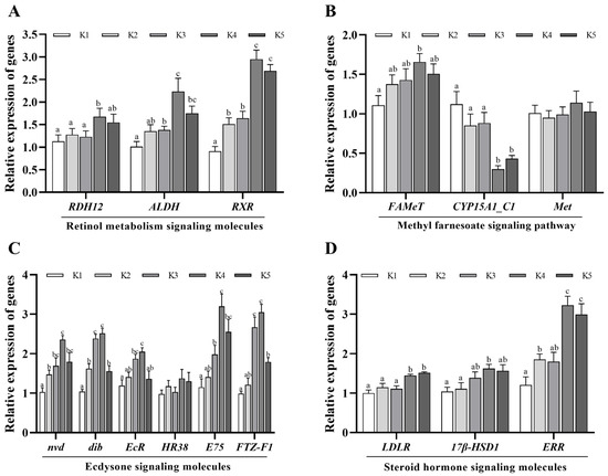 As illustrated in Figure 4, for retinol metabolic signaling molecules, a significant increase in RDH12 mRNA can be observed in the K4 group compared to the K1 group (p < 0.05). No significant effect was observed in the other groups. Concurrently, the expression levels of ALDH and RXR mRNA in the diet supplemented with krill oil were found to be significantly elevated (p < 0.05) in comparison to the K1 group, with the K4 group exhibiting the highest expression level. When compared to the K1 group, the expression of FAMeT mRNA in K4 group was found to be significantly increased (p < 0.05), while the expression of CYP15A1_C1 mRNA was significantly decreased (p < 0.05). The addition of krill oil had no discernible effect on the expression of Met. In the case of ecdysone signaling molecules, the expressions of nvd and dib mRNA in the K2, K3, K4, and K5 groups, which were supplemented with krill oil, were found to be significantly increased in comparison to the K1 group, (p < 0.05). The expression levels of EcR, E75, and FTZ-F1 mRNA in K3, K4, and K5 groups were significantly increased (p < 0.05), whereas no significant difference was observed in the K2 group. The overall trend exhibited an initial increase, followed by a subsequent decrease. The expression levels of each gene in the K4 group were the highest. The addition of krill oil did not affect the expression of HR38. With regard to steroid hormone signaling molecules, the expression levels of LDLR, 17β-HSD1, and ERR mRNA in the K4 and K5 groups, which comprised a high proportion of krill oil, were significantly increased in comparison to control group K1 (p < 0.05). Conversely, the addition of a low proportion of krill oil had no significant effect on these genes.