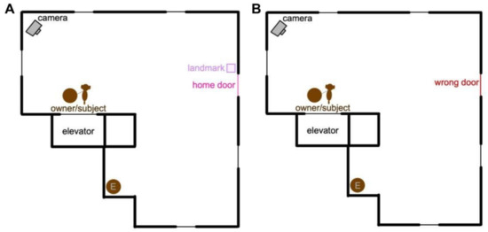 Example layout of an apartment building floor with the subject’s home floor (A) and a floor upstairs from the subject’s home floor, the wrong floor (B). In this example, the subject is presented with the visual landmark, the umbrella stand. The landmark is placed next to the subject’s home door. The camera is on a tripod and is situated to film the same door on both floors, out of the way from the subject. The experimenter (E) is hidden from view of the subject and owner.