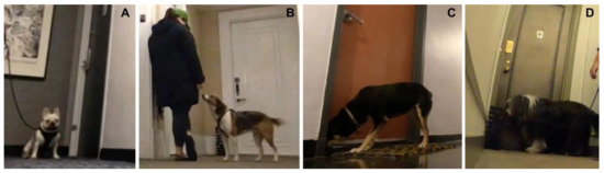 Examples of (A) approach, (B) look at owner, (C) sniff door, and (D) sniff landmark.