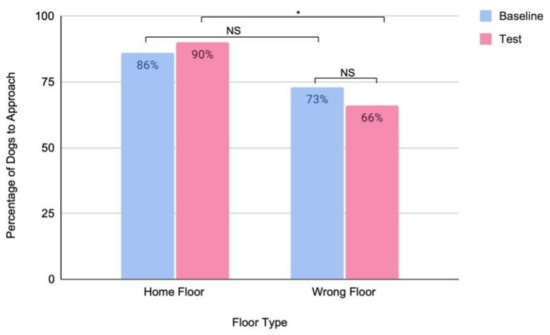 Percentage of dogs to approach the home and wrong floors of their building (n = 29) before (baseline) and after (test) they have time to learn a landmark placed outside of their door (* p = 0.03, NS: not significant).