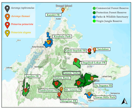 Documented presence of the four giant flying squirrel species in Sabah as mentioned in the literature [6,11,13,15,20,21,22,23,24,25,28,29,30,31,32,33] including: the black flying squirrel (Aeromys tephromelas), the Thomas’ flying squirrel (Aeromys thomasi), the red giant flying squirrel (Petaurista petaurista), and the spotted giant flying squirrel (P. elegans). Pin locations are not specific, only general to the area pinned to. FR = Forest Reserve. Map modified using data compiled by Hutanwatch: Sabah Land-use, which provides data on commercial, domestic and protection forest reserves, as well as areas under “parks and wildlife sanctuaries” and virgin jungle reserves.