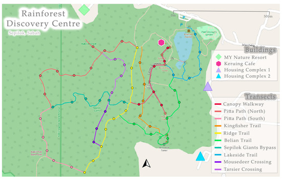 This study took place at the Rainforest Discovery Centre (RDC) within the small village of Sepilok in Sabah, Malaysian Borneo (Figure 2). Opened to the public in 2007, the RDC is one of the most notable ecotourism centres in Sabah, considered a model facility for environmental education, conservation of tropical rainforests and ecotourism [62,63]. The RDC is located in the 106 ha Taman Botanikal Sepilok Forest Reserve area, which constitutes the edge of the Kabili-Sepilok Forest Reserve (4326 ha) [63]. The vegetation is lowland (~0–100 masl) dipterocarp primary forest (Class VI Virgin Jungle) and is accessible via 8 ground trails through the forest as well as the 25 m high canopy walkway [62,64].