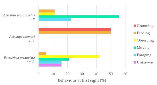 Behaviour at first sight (%) plotted as a bar chart for the black flying squirrel (Aeromys tephromelas) (n = 9), the Thomas’ flying squirrel (A. thomasi) (n = 2) and the red giant flying squirrel (Petaurista petaurista) (n = 19).