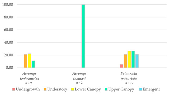 Proportion of observations of the red giant flying squirrel (Petaurista petaurista) (n = 19), the black flying squirrel (Aeromys tephromelas) (n = 9) and the Thomas’ flying squirrel (Aeromys thomasi) (n = 2) within the different rainforest strata.