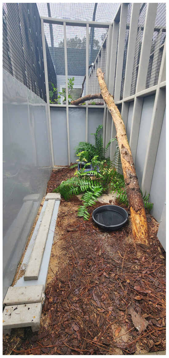 Husbandry for the snakes in this study remained consistent with that of the breeding colony, with the exception of feed type for snakes in the basal and experimental sausage groups. Throughout the study, select EISs were rotated between indoor and outdoor enclosures at the OCIC. Indoor enclosures consisted of rack-style cages with a water dish and appropriate hides and substrates according to regulations described by the Association of Zoos and Aquariums Taxon Advisory Group [25]. Husbandry (enclosure maintenance, health checks, and feeding) was performed by OCIC staff. Snakes were fed to appetite 1–3 times a week depending on body condition and seasonal cycling goals. EISs were seasonally cycled as a means of conditioning the animals for reproduction according to environmental conditions in central Florida. Ambient temperatures were maintained through the facility’s central heating and cooling, and additional heat was not provided. Outdoor enclosures consisted of screen-enclosed pens inside a larger screened-in area. These pens provide the snake with access to filtered natural sunlight, sandy substrate, and naturalistic decor, such as plants, branches, and artificial burrows with keeper-access points (Figure 1). Snakes were moved to their indoor enclosures prior to sample collection and during inclement weather.