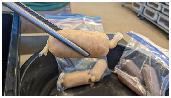 The methodology for sausage preparation was developed based on a protocol for making food-grade sausages. The meat was cut into cubes using a steel meat cleaver and ground with an STX International TurboForce 3000 electric meat grinder (Lincoln, NE, USA). Nutritional supplements for the experimental sausage were thoroughly incorporated by hand prior to the blend being stuffed into fresh beef-collagen casings. One end of the casing was tied off and stuffed with 50–60 g of meat. The casing was cut and tied off, with excess casing cut away above the knot (Figure 2). Casing dimensions of 22, 29, and 32 mm diameter were used throughout the study, with 29 mm being the ideal diameter based on the range of motion in the jaw of an average adult-size EIS. A more thorough methodology with images, tips, and recipes is available as Supplemental Information.