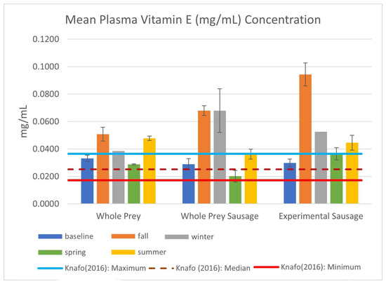 Mean vitamin E (-tocopherol; mg/mL) plasma concentration in EISs consuming whole prey or experimental diets between August 2022 and September 2023, including standard error bars and descriptive statistics from Knafo et al. (2016) [28].