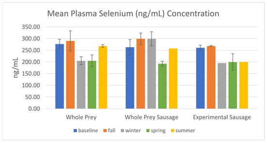 Mean selenium (ng/mL) plasma concentration in EISs consuming whole-prey or experimental diets between August 2022 and September 2023, including standard error bars.
