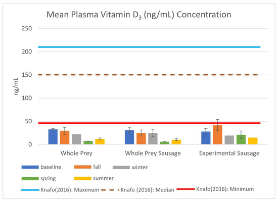 Mean vitamin D3 (ng/mL) plasma concentration in EISs consuming whole-prey or experimental diets between August 2022 and September 2023, including standard error bars and descriptive statistics from Knafo et al. (2016) [28].