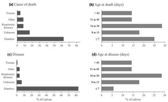 The mortality rates observed in this study can be considered relatively low, considering international references (perinatal: 2–20% []; postnatal: 5–11% []), and similar to a study conducted in the same region []. This may be related to the low number of calves raised by farm in the period (on average 7.7), which may have facilitated the care and individual observation of the animals. For example, the presence of more calves on a farm increases the possibility of calves being housed in groups, which in turn increases the chance of transmission of contagious diseases, which are more common the larger the group of animals [,].