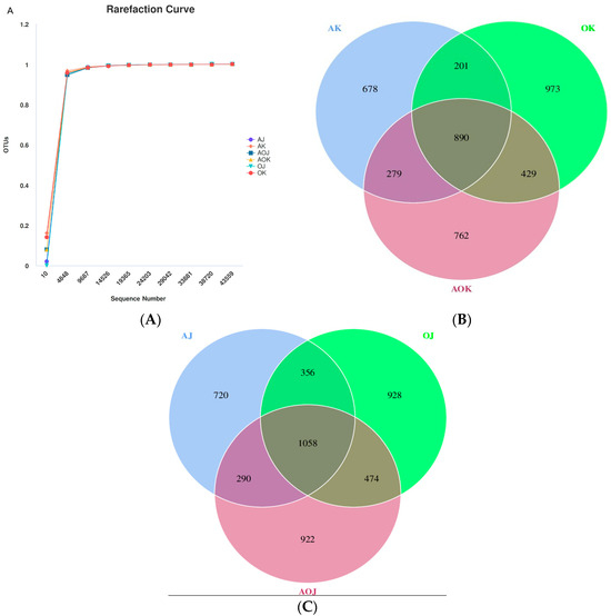 (A) Rarefaction curves of all groups. (B) The Venn diagram shows the bacterial composition of OTUs in the jejunum. (C) The Venn diagram shows the bacterial composition of OTUs in the colon. AK, OK, and AOK represent the jejunum of the AH, OH, and AO groups, respectively; while AJ, OJ, and AOJ represent the colon of the AH, OH, and AO groups, respectively.
