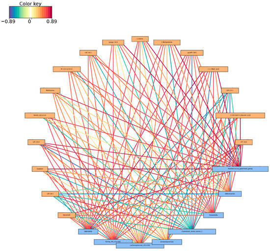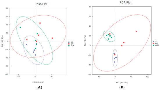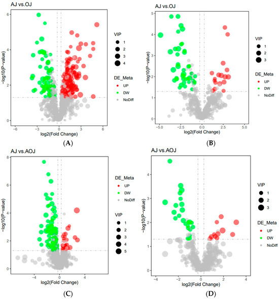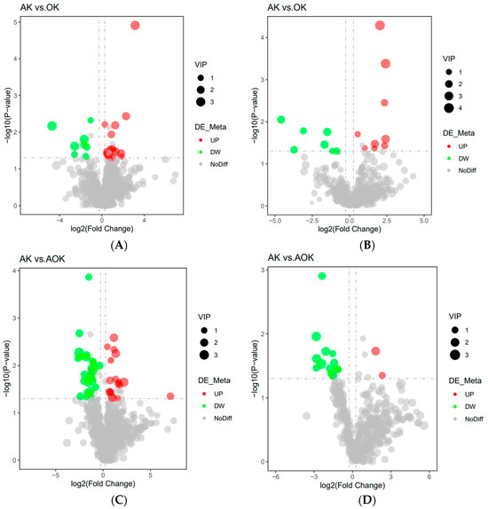 Principal components analysis (PCA) and partial least squares discriminant analysis (PLS-DA) were carried out using metaX (a versatile and all-inclusive program for processing metabolomics data), and these metabolites were identified using the KEGG database (https://www.genome.jp/kegg/pathway.html accessed on 10 February 2018). Statistical significance (p-value) was calculated using univariate analysis (t-test). The metabolites were regarded as differential metabolites if they exhibited VIP > 1 and p < 0.05, a fold change of 2, or an FC of 0.5. The metabolites of interest were filtered using volcano plots based on the log2 (fold change) and log10 (p-value) of the metabolites using ggplot2 in R. Enrichment analysis of metabolic pathways for the differential metabolites was carried out; when the ratio was satisfied by x/n > y/N, the enrichment of the metabolic pathways was confirmed; when the p-value for the enrichment of the metabolic pathways was 0.05, the enrichment of the metabolic pathways was deemed statistically significant.