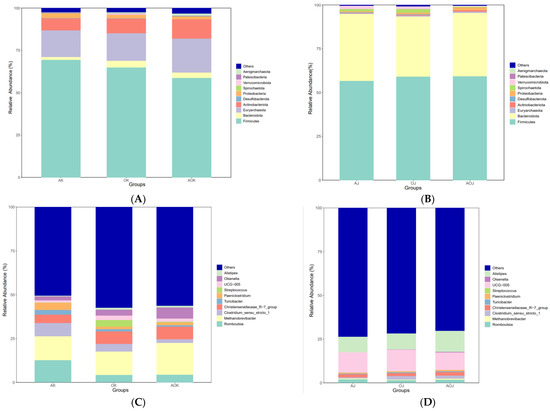We evaluated the relative abundance of the dominant bacteria at both the phylum and genus taxonomical levels in each sample. Across all groups, Firmicutes emerged as the most abundant phylum in both the jejunum and colon, accounting for over 56.63% of the total sequences. In the jejunum, Euryarchaeota followed as the second most dominant phylum, with the AH group showing 15.71%, the OH group 16.22%, and the AO group 20.16%. In contrast, in the colon, Bacteroidota took the second spot, with abundances of 38.24% in the AH group, 34.42% in the OH group, and 36.27% in the AO group (Figure 3A,B).