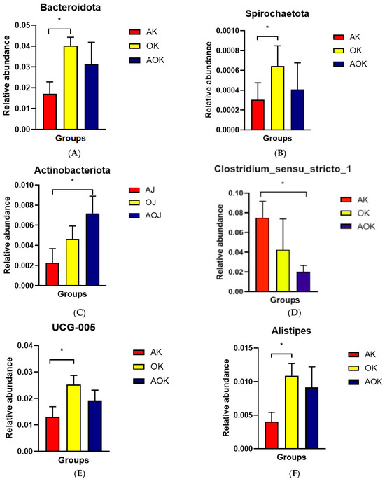 Subsequently, t-tests were performed to compare the OH group with the AH group and the AO group with the AH group, aiming to precisely delineate the disparities in microbial composition among distinct groups. Within the jejunum, Bacteroidota and Spirochaetota exhibited a notably higher prevalence in the OH group compared to that in the AH group (p < 0.01) (Figure 4A,B). Conversely, in the colon, the AO group demonstrated a significantly increased abundance of Actinobacteria relative to that in the AH group (p < 0.05) (Figure 4C). At the genus level, within the jejunum, UCG-005 and Alistipes were significantly enriched in the AO group compared to the OH group (p < 0.05), whereas Clostridium_sensu_stricto_1 displayed a significantly reduced abundance in the AO group in comparison to the AH group (p < 0.05) (Figure 4D–F).
