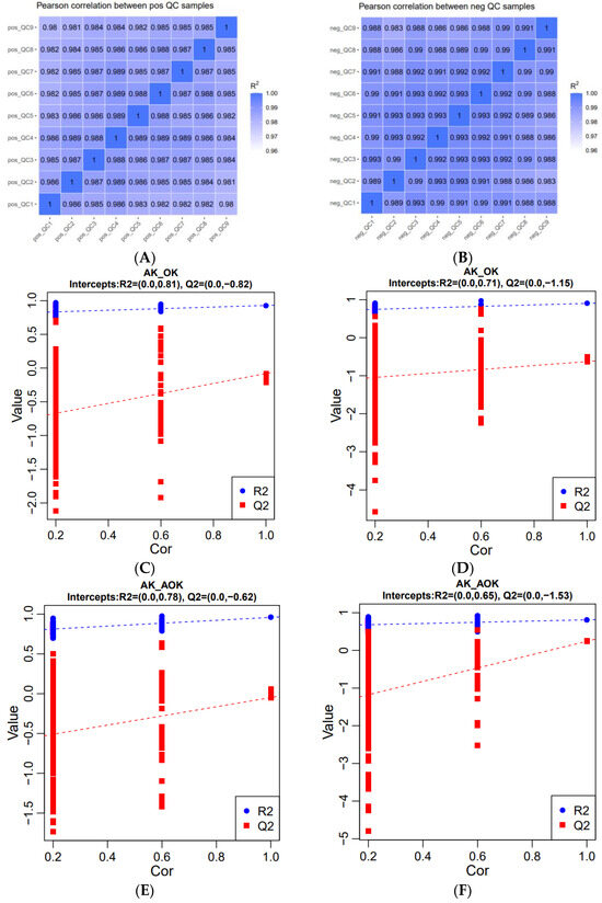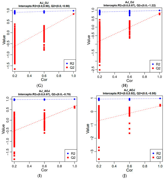Equal amounts of experimental and quality control (QC) samples were combined to test the system’s stability. The closer the R2 value is to 1, indicating a stronger correlation, the more stable the entire assay procedure becomes, resulting in higher-quality outcomes. Figure 5A,B demonstrates that the measurement data quality is quite good. Upon positive- and negative-mode ionization, projection to latent structures discriminant analysis (PLS-DA) was used to analyze the QC samples, aiming to describe the general metabolomic variations across various groups. According to the PLS-DA permutation test, the original points on the right exhibited higher values than the R2 and Q2 values on the left. Additionally, the Q2 regression curve has a negative intercept, which demonstrates the reliability and validity of the PLS-DA model (Figure 5C–J).