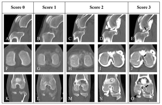 Standard of scoring for visualization of stifle joint ligamentous structures and menisci in CT arthrography. Sagittal (A–E), Axial (F–J) and coronal (K–O) planes. Scores are assigned as follows: Score = 0 (non-visualized (A,F,K)), Score = 1 (poorly visualized (B,G,L)), Score = 2 (visualized with minor limitations such as underfilling (C,H,M) or with artifacts (D,I,N)), and Score = 3 (well-visualized with clear detail (E,J,O)). In images with a score of 3, note the cranial cruciate ligament (black arrow), caudal cruciate ligament (white arrow), meniscofemoral ligament (*), medial meniscus (black arrowhead), and lateral meniscus (white arrowhead).