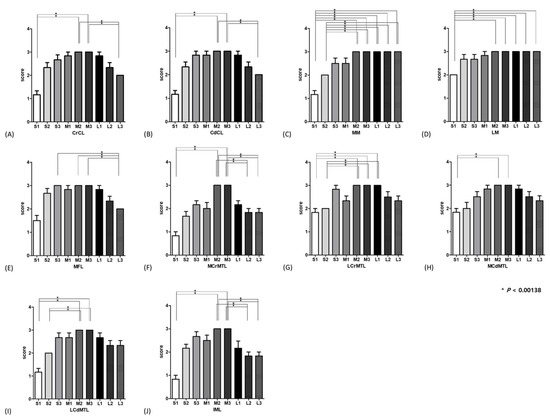 The graphs illustrate the average visualization scores for the ligamentous structures and menisci of the stifle during extension in each group. This includes: (A) cranial cruciate ligament, (B) caudal cruciate ligament, (C) medial meniscus, (D) lateral meniscus, (E) meniscofemoral ligament, (F) medial cranial meniscotibial ligament, (G) lateral cranial meniscotibial ligament, (H) medial caudal meniscotibial ligament, (I) lateral caudal meniscotibial ligament, (J) intermeniscal ligament.