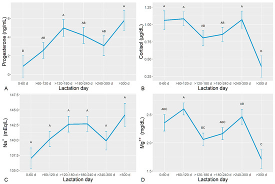 The circulating blood parameter concentrations are shown in Table 3. The mean ± SE plots of parameters that were significantly affected during the lactation phase, progesterone (A), cortisol (B), Na+ (C), and Mg++ (D), are presented in Figure 1.