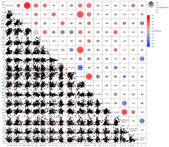 The impact of lactation was reflected by the significant correlations between P4 with cortisol (r = −0.3964, p = 0.0010), Cl− (r = 0.4421, p = 0.0002), and K+, (r = −0.3826, p = 0.0013), and the significant correlations between cortisol with Ca++ (r = −0.3573, p = 0.0035) and LDH (r = −0.2944, p = 0.0173). The correlation plot among all the parameters is reported in Figure 2.