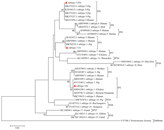 Blastocystis exhibits considerable genetic diversity, with over 40 subtypes (STs) identified in humans and animals [15,16,17]. Among the approved subtypes of Blastocystis species, ST1 to ST10, ST12 to ST14, ST16, ST23, ST35, and ST41 have been documented in humans [15,18]. Blastocystis infection in pigs has been reported worldwide, with an overall incidence rate of 52.4%. This infection encompasses eight zoonotic subtypes (ST1–ST7, ST10) and one subtype specifically adapted to pigs or suids (ST15), with ST5 being the dominant subtype [19]. In China, research on pigs has revealed the presence of ST1, ST3, ST5, and ST10, with ST5 also being the dominant subtype [20]. Given the presence of identical Blastocystis subtypes in humans and pigs and the similarity or exact match in their nucleic acid sequences, investigating the distribution of Blastocystis subtypes in reared pigs is crucial for preventing potential zoonotic infections in humans.