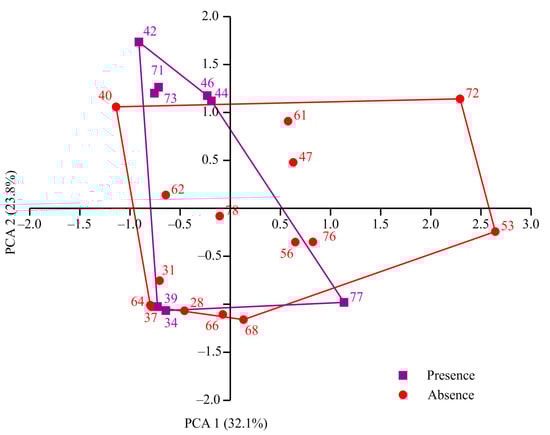 The sampling stations encompassed depths ranging from 49 to 419 m. Water temperatures varied between −1.88 and 3.4 °C, and salinity levels ranged from 34.6 to 35.35. Individuals of Macoma calcarea were found at eight stations, the majority of which were situated along the western coast of Spitsbergen. However, no mollusks were observed in Billefjorden and at the majority of deep-water stations. PCA separated sampling stations along axis 1, which explained 32.1% of the total variation, by depth (factor loading 99.9%), with deeper stations (most stations where Macoma calcarea was not recorded) on the right (mean depth 179 ± 28 m) and shallower stations on the left (123 ± 23 m). Axis 2 explained 23.8% of the total variation and separated stations by water temperature (factor loading 98%) so that most stations from warmer waters where Macoma was present were located in the upper part of the plot (Figure 2).