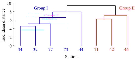 The first cluster, Group I, consisted of stations primarily located in the cold waters of Storfjorden (stations 34, 39, and 77) alongside two additional stations—one in front of Hornsund (station 73) and the other in Grønfjorden (station 44). Group II comprised stations 42 and 46 located in Grønfjorden and station 71 from Coles Bay. PERMANOVA confirmed the significance of this differentiation (F = 13.1, p = 0.018). More specifically, Group I stations displayed significantly lower abundance, biomass, shell length, and age values (Table 1).