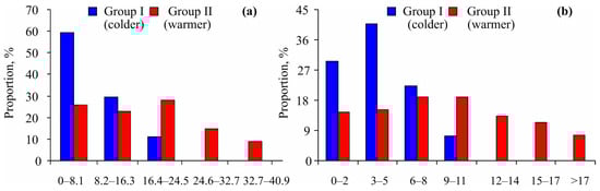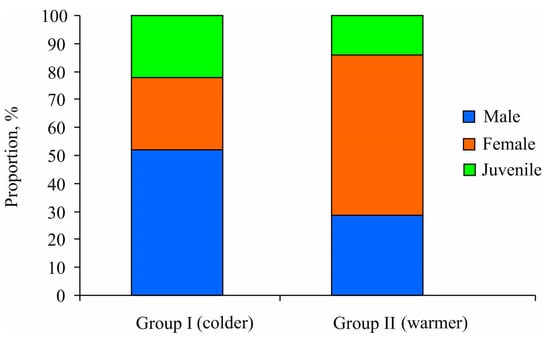 Furthermore, the size–frequency distribution of Macoma calcarea showed a bias toward smaller specimens in Group I, while mollusks from Group II were distributed more randomly within their size classes (Figure 4a). A chi-square test indicated significant differences between the two groups (χ2 = 17.62, p = 0.001). Similarly, younger individuals were more prevalent at stations belonging to Group I (χ2 = 21.71, p = 0.001) (Figure 4b).