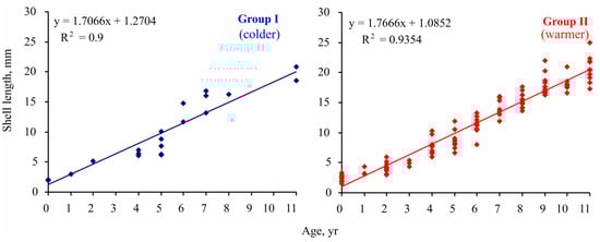 The implementation of Maximovich’s method revealed significant differences in individual growth rates of Macoma calcarea in Svalbard fjords. Specifically, the size of the fifth growth ring ranged from 6 to 11 mm, and clustering delineated two groups: slow-growing individuals with a growth rate of 7 mm per five years and relatively fast-growing mollusks with a growth rate of 8.5 mm per five years. Although specimens belonging to these groups were found in both station complexes, the group growth pattern corresponded with the main findings for Clusters I and II. As depicted in Figure 6, in each age class, mollusks from Group II reached a larger size than specimens from Group I, a difference that was statistically confirmed (linear slope for group I = 1.706 ± 0.124 < linear slope for group II = 1.767 ± 0.045; ANCOVA, F = 1674.82, p < 0.001).