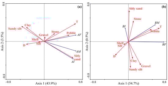 Ordination of samples by redundancy analysis with respect to Macoma calcarea abundance (a) and biomass (b) and their relationships with environmental variables in Svalbard fjords. The proportions of the total variability explained by the first two axes are given. Biological variables: AI—abundance of immature mollusks; AF—abundance of females; AM—abundance of males; BI—biomass of immature mollusks; BF—biomass of females; BM—biomass of males. Environmental variables: D—depth; T—temperature; S—salinity; Silt, Clay, Gravel, Pebble, Sandy silt, Stone, Silty sand, and Shell—substrate types.