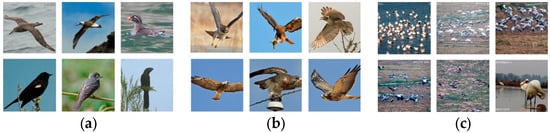 The bird identification accuracy and reliability depend heavily on the availability of rich and diverse datasets. This is especially important due to the dynamic behavior of birds, such as flight and perching postures, as well as their activities in different environments, e.g., lighting conditions, background complexity, and occlusion, all of which affect the recognition accuracy. Commonly used bird detection datasets which focus on fine-grained bird identification like Caltech-UCSD Birds-200-2011 [23] and North America Birds [24] typically include only one bird per image and do not contain the complex background conditions, occlusions (within species, between different species, and from the environment), and multi-scale targets encountered in real-world scenarios (Figure 1). As such, they may not be useable for bird recognition tasks in natural settings.