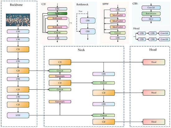 YOLOv8 network structure. (1) The YOLOv8 network model is composed of three parts: the backbone, the neck, and the head. (2) YOLOV8 includes CBS module, the Cross Stage Partial with two fusion (C2f) module, the Spatial Pyramid Pooling-Fast (SSFF) module, and Head module. The CBS module consists of convolution, batchnorm, and a sigmoid linear unit (SiLu) function, and it is named after the initials of these components. The Head module is used for the final classification and regression tasks. (3) The Concat is used to concatenate multiple data tensors along a specified dimension.