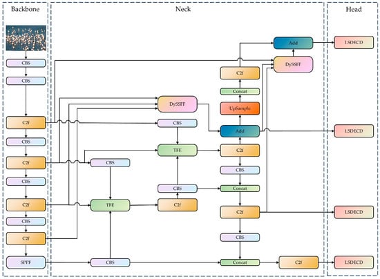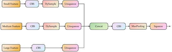 The DySample module avoids the potential loss of small-object feature information during upsampling by specifying the sampling angles during upsampling [37], effectively exploiting semantic information within feature maps, and enriching the semantic relationships at different scales. Compared to traditional upsampling methods, DySample has a better adaptability to the pixel information and content features of the feature map. Figure 5 shows the improved DySSFF module structure. By combining DySample and the SSFF, the resulting DySSFF module fully leverages the advantages of dynamic upsampling and feature fusion. It enhances the model’s feature fusion capabilities, achieves more efficient multi-scale feature integration, and prevents the loss of small-object feature information.