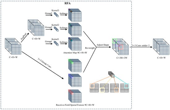 First, convolution is applied to the input feature map to generate an initial set of feature maps. The additional computational overhead associated with interactions between receptive field features is reduced by using average pooling to aggregate the global information for each receptive field. Second, a 1 × 1 group convolution is performed to facilitate information exchange. Last, Softmax is employed to emphasize the importance of each feature within the receptive field (Figure 4).