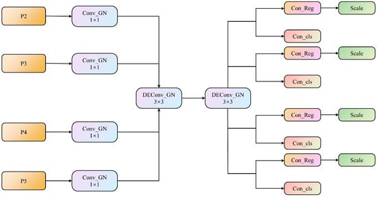Once the feature inputs are received from the P2–P5 layers, the LSDECD first applies the GN-based standard convolution with a kernel size of 1 × 1 to each of the four levels. This step facilitates the information exchange across channels, enriches the amount of target information, and improves the classification and regression performance of the detection head. Second, two GN-based shared DEConv modules each with a kernel size of 3 × 3 are used to aggregate the rich spatial and semantic information from the four levels. Last, the information extracted by the shared convolution is input into the classification and regression heads (Figure 6). A scale layer containing a learnable scaling factor is employed to deal with inconsistent target sizes across detection heads and to prevent the loss of small-object feature information. This layer adjusts the features in the regression head, which enhances the multi-scale feature retention.