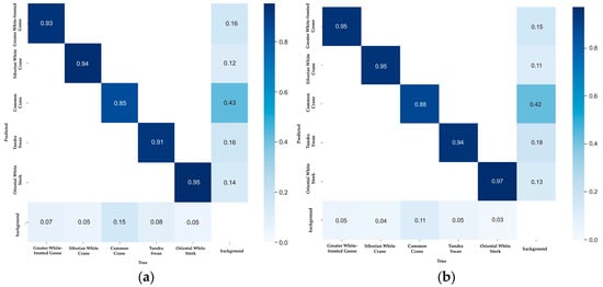 Comparison of the normalized confusion matrices: (a) YOLOv8; (b) YOLOv8-bird. In the confusion matrix, the elements on the main diagonal represent the number of correctly detected samples; the elements in the lower triangular region indicate the number of missed detections by the model; and the elements in the upper triangular region correspond to the number of false detections by the model.