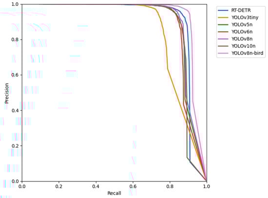 The Precision–Recall curve evaluates the performance of classifiers comprehensively using precision and recall as the key metrics. A curve closer to the top-right corner indicates that the model achieves higher precision and recall across different thresholds, reflecting a better overall performance. The YOLOv3tiny curve drops sharply at higher recall values (Figure 8), suggesting that the model experiences a significant decline in precision when detecting more targets, leading to an increased number of false positives. The overall performance levels of RT-DETR, YOLOv5n, YOLOv6n, YOLOv8n, and YOLOv10n are relatively similar, with strong performances observed in the medium-to-high recall regions. The YOLOv8n-bird curve lies above the other model curves, effectively enveloping them. This indicates that YOLOv8n-bird outperforms the other models in overall performance, further demonstrating the significant improvements achieved by the optimized YOLOv8-bird model in bird detection tasks.