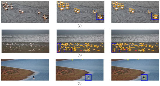Comparison of YOLOv8 and YOLOv8-bird detection performance in each scenario: (a) occluded scene; (b) dense samll target scene; (c) multi-scale scene. The left image is the original, while the middle and right images show the detection results from the YOLOv8 and YOLOv8-bird models, respectively. The blue boxes highlight areas with a significant number of missed detections. The orange, red and yellow represent the detected Tundra Swan, Greater White-fronted Goose and Oriental White Stork.