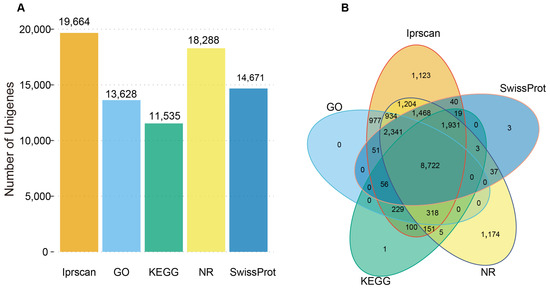 In order to generate comprehensive information on the gene function of the predicted unigenes, the transcripts were subjected to annotation analysis using five public databases, including Iprscan, GO, KEGG, NR, and SwissProt. Our results revealed that among a total of 25,434 unigenes, 20,887 were successfully annotated with at least one hit. A total of 19,664 and 13,628 transcripts were annotated to the Iprscan and GO databases, respectively, while 11,535, 18,288, and 14,671 transcripts were annotated to the KEGG, NR, and SwissProt databases, respectively (Figure 1A). In total, 8722 transcripts were annotated in all databases (Figure 1B).