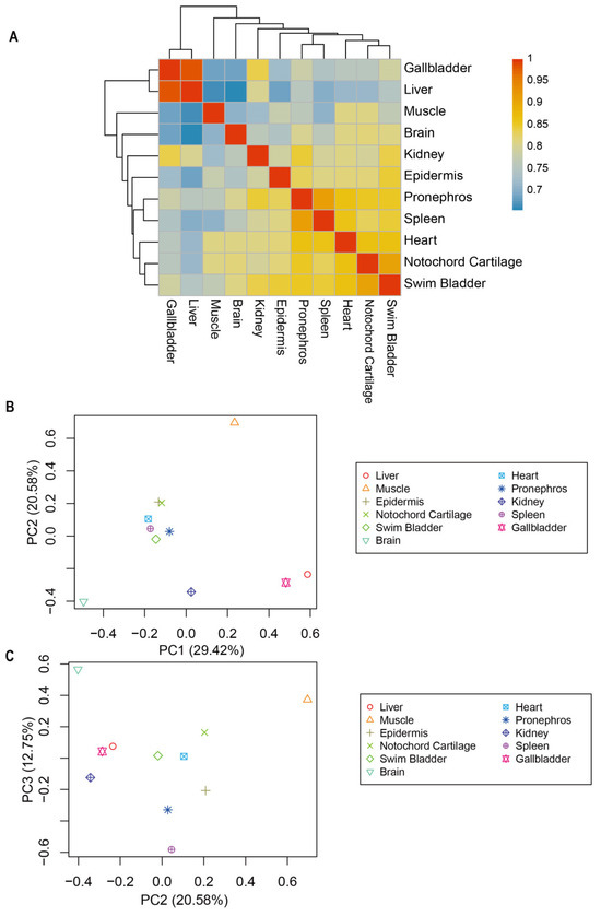 The second approach involved a widely utilized PCA ordination method to represent variations among transcriptomes in a multidimensional space, where PC1 and PC2 accounted for 50% of the total variability (Figure 3B), and PC2 and PC3 accounted for 33.33% of the total variability (Figure 3C). For the comparison of inter-tissue relevance, the patterns derived from PCA had similarities to the outcomes obtained by Pearson’s correlation analysis. Notably, a minimal correlation was observed between the brain and muscle compared to other tissues, whereas the most significant correlation was identified between the gallbladder and liver (Figure 3B,C). Additionally, a notable correlation was found among the tissues of the epidermis, notochord cartilage, heart, spleen, swim bladder, and pronephros (Figure 3B), which is consistent with the findings based on the Pearson correlation coefficients.