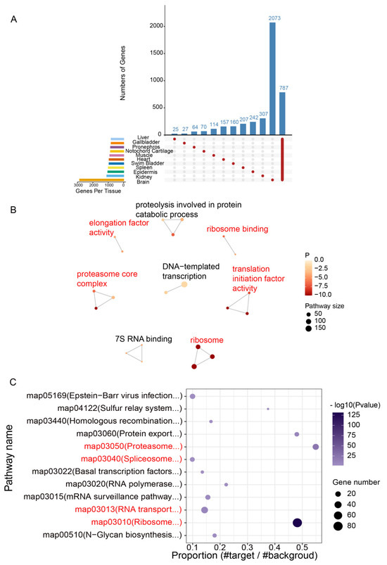 Identification of HKGs and functional enrichment analysis. (A) UpSet plot of shared and unique genes from each of the eleven tissue-specific transcriptomes of Chinese sturgeon. (B) Network diagram showing the significantly enriched GO terms for HKGs. (C) Bubble chart of significantly enriched KEGG pathways for HKGs.