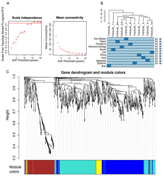 Construction of a weighted gene co-expression network based on the HKG TPM expression matrix. (A) An examination of the scale-free topology model fit index for soft threshold power (β) and the mean connectivity for soft threshold powers. The horizontal axis represents β, and the vertical axis on the left represents the corresponding log(k) and log(p(k)) in the network. The higher the square of the correlation coefficient, the closer the network is to a scale-free distribution. The adjacency matrix was defined using soft thresholds with β = 12. (B) Hierarchical clustering diagram of the eleven tissues of Chinese sturgeon. (C) A dendrogram showing the hierarchical clustering based on the TOM matrix derived from the gene expression data. Various colors correspond to distinct modules, in which the grey module indicates no co-expression among the genes.