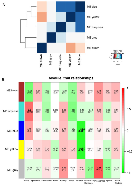 Module and eigengene network plot. (A) Analysis of the correlation between modules. (B) A heatmap visualization showing the adjacencies within the eigengene network. The diagram shows modules in the rows and phenotypes (tissues) in the columns, with colored blocks indicating the association between them. The heatmap used a color palette in which green represents low adjacency, indicating a negative correlation, while red represents high adjacency, indicating a positive correlation. The numerical values within the colored blocks denote the Pearson correlation coefficients, while those in parentheses are p-values. Blocks with p ≤ 0.05 were deemed to show statistically significant correlations.